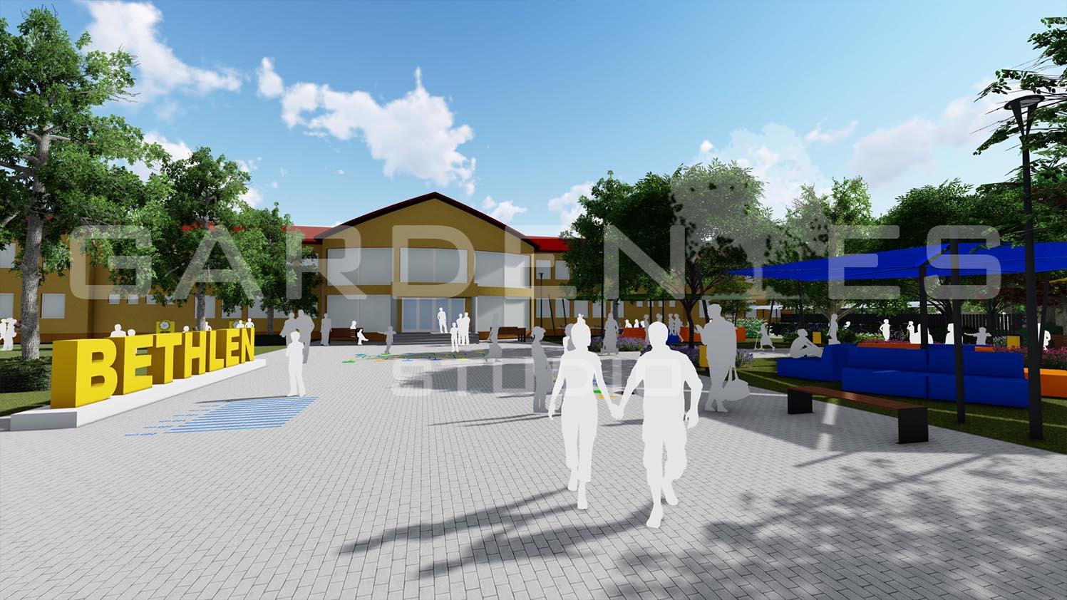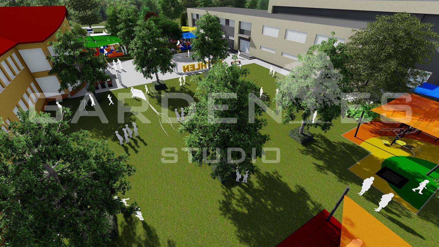 A tervezési feladatom az intézményhez tartozó régi és új iskolaegység közötti udvarrész és az újonnan kialakított parkoló zöldfelületi terveinek elkészítése. A játszóudvaron 3 nagyobb különböző funkciójú területet alakítottam ki. A terület főbejárathoz közelebb eső, déli részén került kialakításra egy kisebb várakozó / közösségi tér. A lapburkolatos területen napvitorlás árnyékolók alatt pad-asztal kombinációk kerültek elhelyezésre. A terület közvetlen kapcsolatba van az új épület déli földszintjén kialakított ebédlővel, így alkalmassá válik kisebb rendezvények megtartására, vagy jó időben az ebédek elfogyasztására. A várakozó tér északi és keleti oldalán egy-egy közösségi pihenő-, beszélgetős területet alakítottam ki. Mindkét helyen napvitorlás árnyékolók alatt vagány, fiatalos, színes, nagyméretű ülőbútorokat és kültéri, mozgatható ping-pong asztalokat helyeztem el. A meglévő épület és az új épület bejárati tengelyében széles, szabad burkolt részt terveztem, mely alkalmas iskolai rendezvények, családi napok megtartására. A nagy egybefüggő burkolatot aszfaltfestésekkel színesítettem.