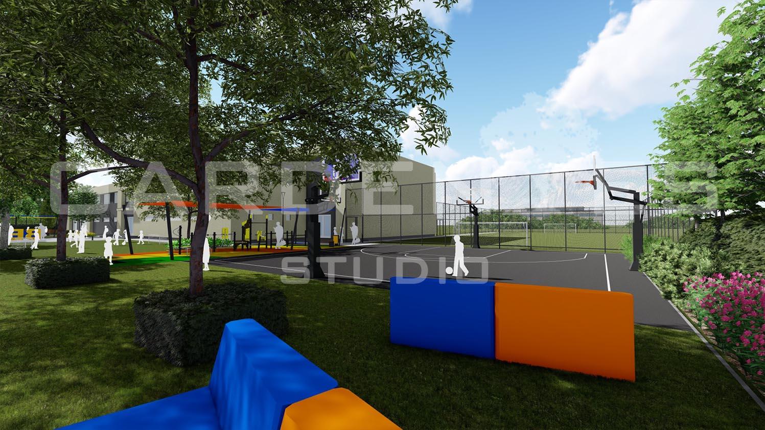 A következő egység egy szabad, műfüves borítású terület, melyet északi és déli oldala mentén nagytermetű fákkal határoltam, melyek később árnyékolják majd a területet. A terület lehetőséget biztosít különféle labdajátékok és nagyobb helyigényű csoportos játékok lebonyolítására. A terület meglévő játszóeszközei nyugati oldalán került kialakításra egy aszfalt burkolatos szabványos méretű streetball pálya, melyhez 4 szabványos méretű kosárpalánkot helyeztem el. A burkolaton jelöltem a kosárlabda játék dobóköreit és a játékhoz szükséges egyéb felfestéseket is. A pálya nyugati oldalán 5 méter magas labdafogó háló zárja a területet. A tervezett tornacsarnok keleti kijárata és a streetball pálya által közre zárt területen öntött gumi burkolaton helyeztem el egy többfunkciós streetworkout egységet és egy négyzet alakú trambulint. A kondicionáló egység több mozgásformát egyesít. Vannak statikus és dinamikus elemei is, így minden sportolni-, erősödni vágyó megtalálhatja a neki megfelelő eszközt, melyet kiegészíthet a trambulin adta lehetőségekkel. Az egység testnevelés óra alkalmával is jól használható.