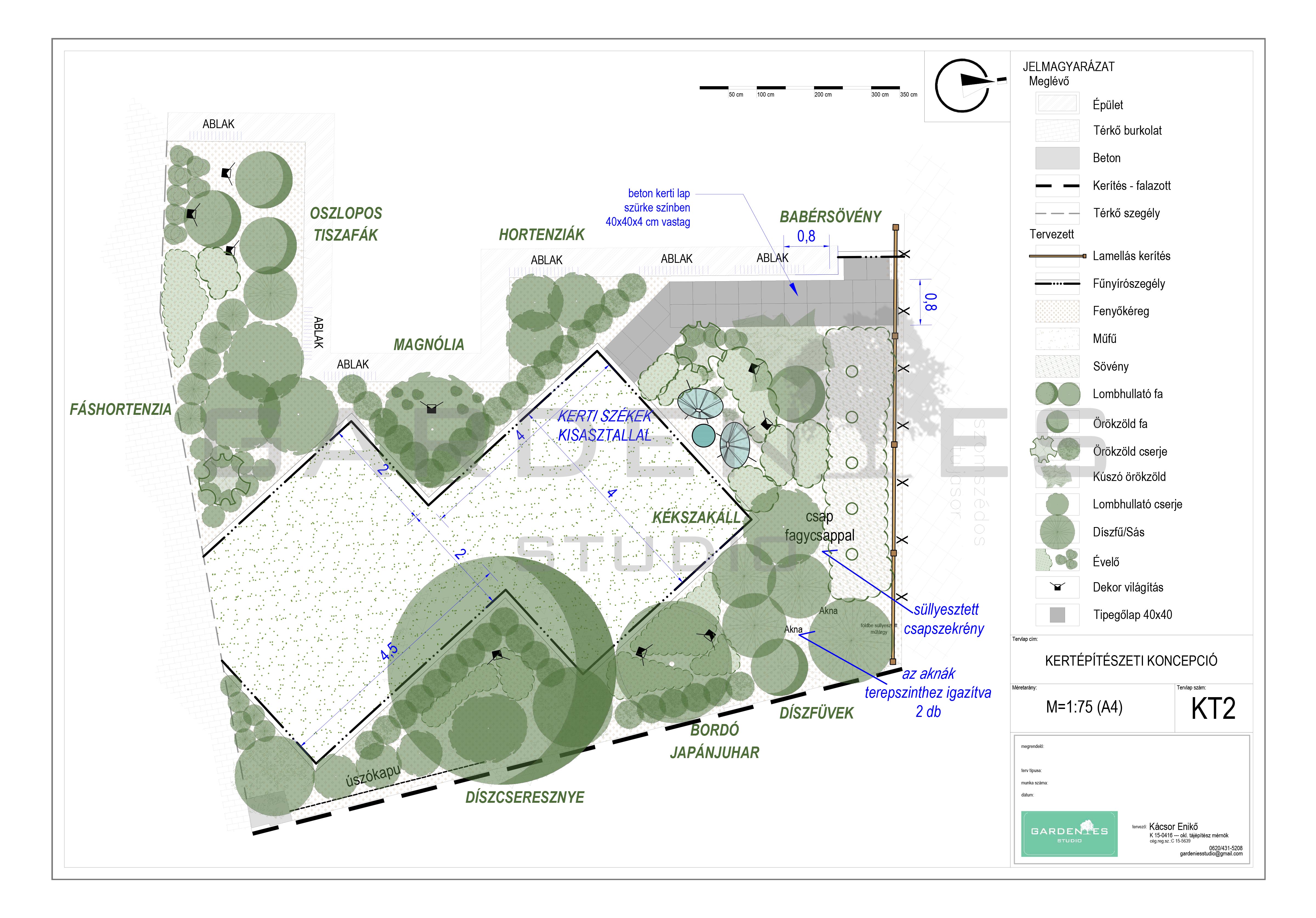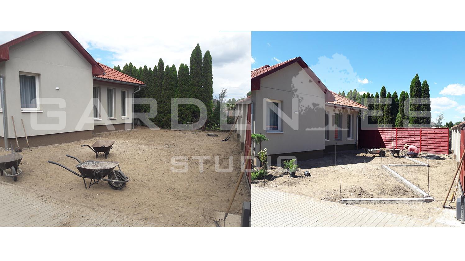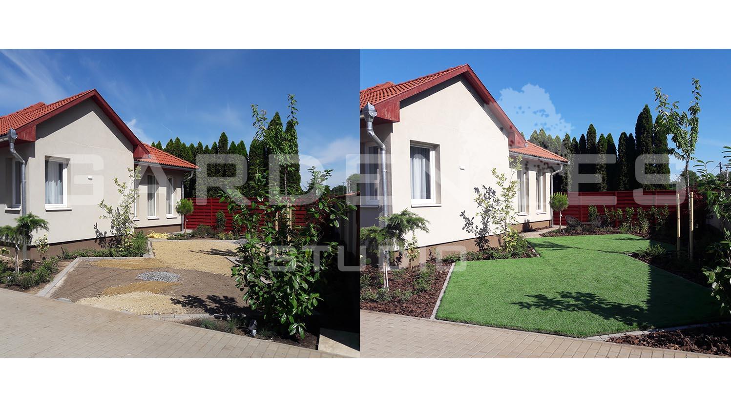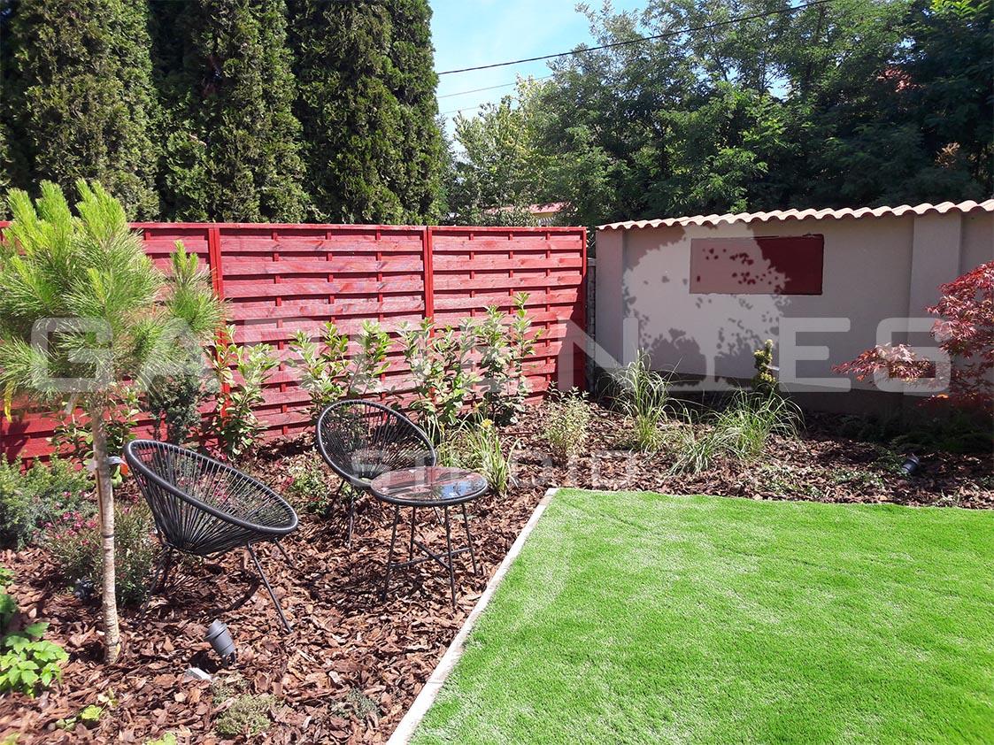 Ikerházas beépítés utcafronti épületéhez tartozó kert megtervezése és kivitelezése volt a feladatom. A Megrendelői igények között szerepelt, hogy egy könnyen fenntartható, pihenésre alkalmas kertrészt hozzak létre. A terület napos oldalán helyet kapott egy kis helyigényű szék-asztal kombináció, ahonnan a kerttulajdonos élvezheti a kert látványát. A kerítés mentén U alakban vegyes, sok virágzó évelőt tartalmazó ágyást hoztam létre. Az üres falfelületeket tekintet vonzó nagytermetű cserjékkel és oszlopos örökzöldekkel törtem meg. A növények közelébe telepített leszúrható, dekor világítótestek gondoskodnak a kert esti hangulatáról. A terület közepén elhelyezett szabad gyepes részen Megrendelői kérésre a heti fűnyírási „gondokat’ műfű telepítéssel oldottam meg.