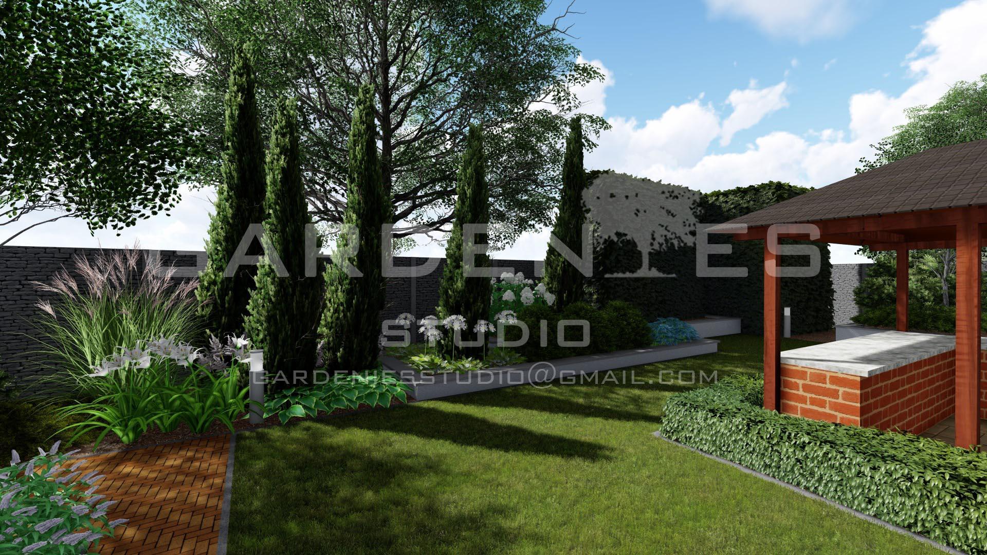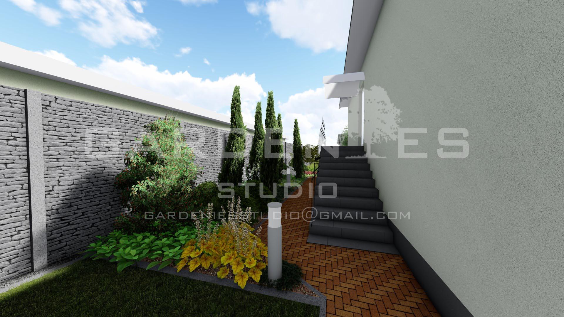 Ebben a munkában egy meglévő ház, meglévő kertjének átalakításával bíztak meg. A kertben a burkolatokat, a kerítést és a hátsókertben elhelyezett fedett kerti sütőhelyet megtartották, így ezeket adottságnak tekintettem. A garázs és a lakóház között elhelyezkedő előkertben jól megkomponált vegyes növényágyásokat alakítottam ki a kisebb gyepfelületek mellett. A lakóépület főbejárata előtt oszlopos tiszafákból és vegyes félárnyéki takartakaró évelőkből álló kompozíciót terveztem. A hátsókertben lévő kerti sütőhely körül meghagytam a szabad gyepfelületeket és a kerítés előtt hoztam létre különböző magasságú és szélességű kiemelt ágyásokat. A szomszédos telkek felőli belátást és rálátást a kerítést túlnövő, örökzöld sövénysávokkal és lombtartó cserjesorokkal takartam.